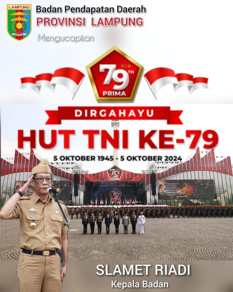 BANDAR LAMPUNG IKLAN IKLAN HUT TNI Ke – 79 admin Oktober 13, 2024 0 Bagikan ke : Jumlah Pembaca: 135Continue ReadingPrevious Momentum Debat Perdana Bakal Jadi Suksesi Besar Bagi Pasangan Mirza-JihanNext Rahmat Mirzani Djausal Ajak PKB Bersama Membangun Lampung di Muskerwil DPW PKB Provinsi Lampung More Stories BANDAR LAMPUNG IKLAN KOTA METRO LAMPUNG BARAT LAMPUNG SELATAN LAMPUNG TENGAH LAMPUNG TIMUR PESAWARAN TULANG BAWANG TULANG BAWANG BARAT Uncategorized Iklan Sellamat Hari Guru admin November 26, 2025 0 BANDAR LAMPUNG UKW 2025, PWI Lampung Cetak 31 Wartawan Kompeten admin November 21, 2025 0 BANDAR LAMPUNG DAERAH Marindo Raih Penghargaan Sekda Terbaik 2025 admin November 20, 2025 0 Tinggalkan Balasan Batalkan balasanAlamat email Anda tidak akan dipublikasikan. Ruas yang wajib ditandai *Komentar *Nama * Email * Situs Web Simpan nama, email, dan situs web saya pada peramban ini untuk komentar saya berikutnya. Δ