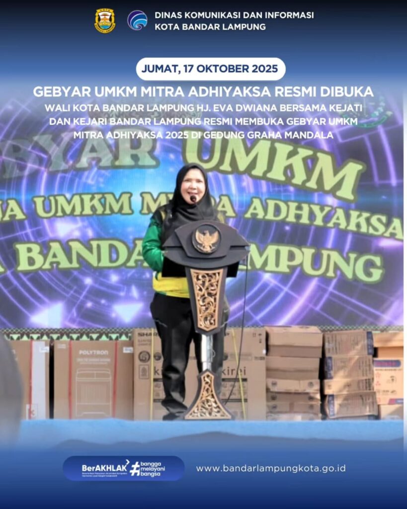 Bandar Lampung–(Handalnewa.id) Wali Kota Bandar Lampung Hj. Eva Dwiana bersama Kejati Lampung Danang Suryo Wibowo dan Kejari Bandar Lampung Baharuddin resmi membuka Gebyar UMKM Mitra Adhiyaksa (UMA) di Gedung Graha Mandala, Jumat (17/10/2025).