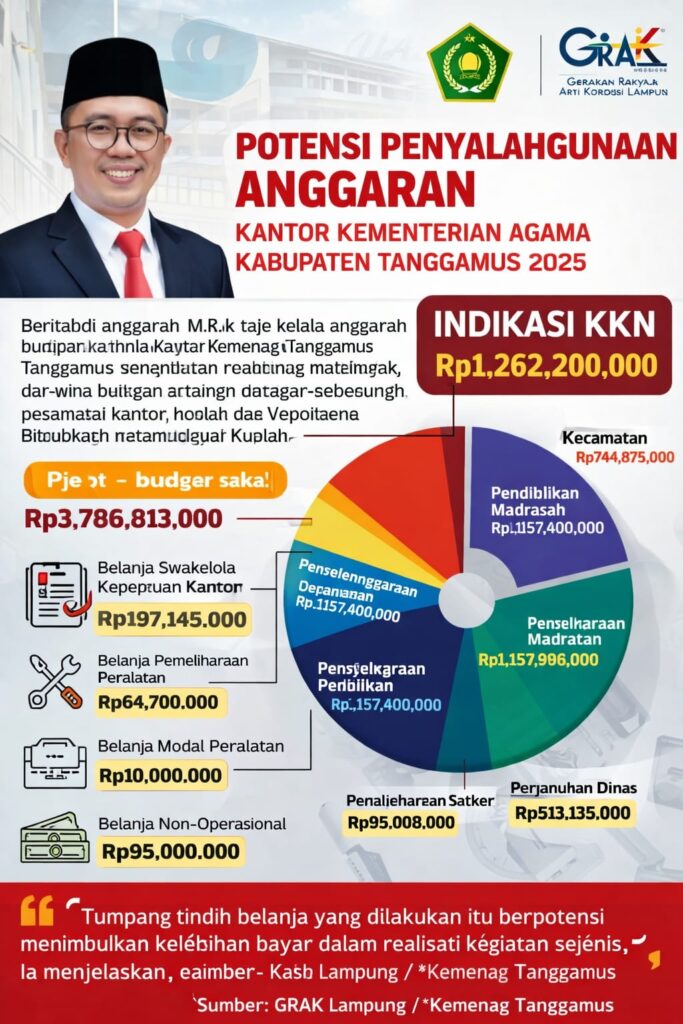 Koordinator Gerakan Rakyat Anti Korupsi (GRAK) Lampung, Chaidir, menyebut jika lima kategori pelaksanaan kegiatan milik Kantor kementerian Agama (Kemenag) Kabupaten Tanggamus meliputi belanja operasional dengan total nilai anggaran sebesar Rp2.524.613.000 yang dipecah kedalam beberapa kegiatan seperti operasional kantor urusan agama kecamatan sebesar Rp744.800.000; dukungan operasional penyelenggaraan pendidikan Rp1.157.400.000; operasional pendidikan madrasah Rp278.075.000; operasional pemeliharaan kantor Rp170.938.000 dan belanja operasional satuan kerja Rp173.400.000.